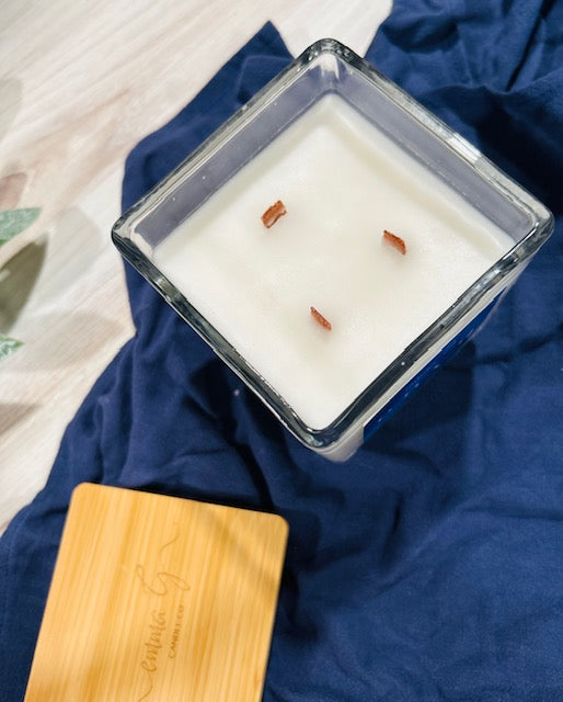 Emma G's triple wood wick candles are made with a luxurious scented soy blend wax, each hand poured into our beautiful clear square glass vessel, adorned with a beautiful bamboo lid with a silicone seal and our company logo. This lid is perfect to use to store your candle or even snuff the candle. Our three perfectly placed crackling wood wicks enhances the candle's melt pool for a more diverse and enhanced fragrance to fill your space. This candle has an elegant design and will sure to be a topic of conversation.